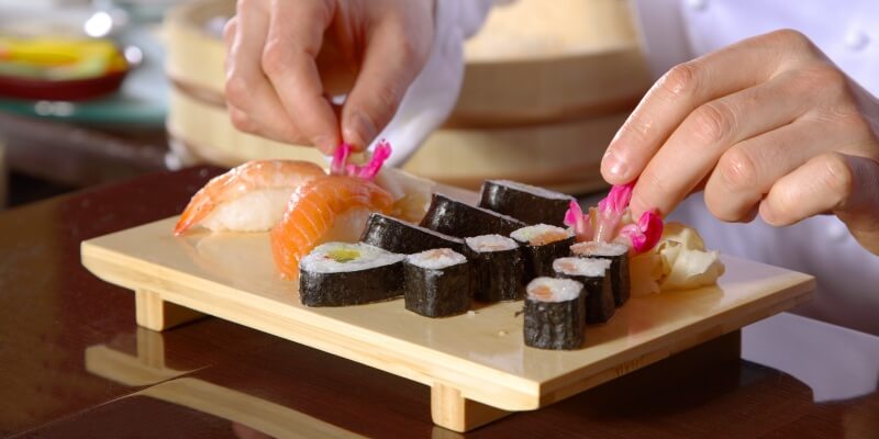 Sushi chefs, along with their apprentices, often wear specially designed geta during their work. These geta are notably taller than usual. This additional height serves multiple purposes: it keeps the chefs elevated above any spills or debris on the kitchen floor, gives them a better view over the counters for preparing and serving dishes, and facilitates easier interaction with customers. The height also helps in maintaining a traditional ambiance in Japanese restaurants, complemented by the rhythmic clacking of wooden geta as chefs move around, enhancing the dining experience.