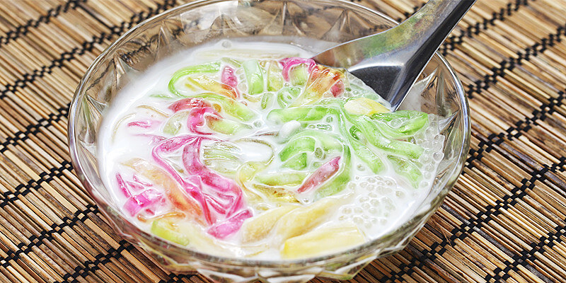 The chewy spheres are made from rice flour dyed in different colors like purple, green, blue, and yellow. To give a funky look to the soup. The rainbow rice bowls float in the soup made of coconut milk and palm sugar.